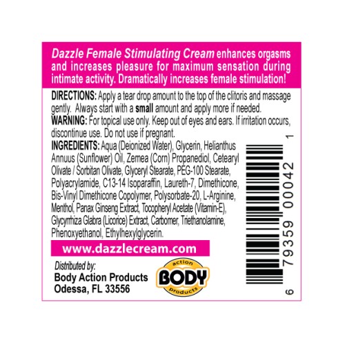 Dazzle Female Stimulating Cream enhances orgasms and increases pleasure for maximum sensation during intimate activity. Dramatically increases female stimulation.