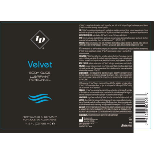 Formulated in Germany Id Velvet Body Glide is the most luxurious of all lubricants. ID Velvet's unique super premium formula is extra long latex compatible and fragrance free. Never sticky or tacky this velvet smooth lubricant also serves as a fantastic skin conditioner and moisturizer.