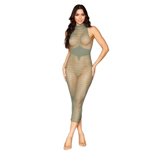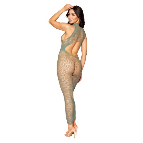 Seamless geometric fence net design bodystocking gown. Opaque knitted collar and waist corset with open back detail. (G-String not included).