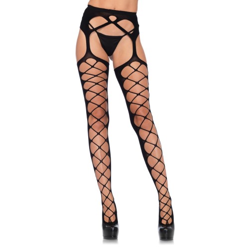 Diamond Net Opaque Stockings with Attached Garter - Black - One Size