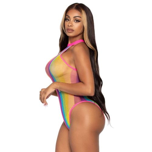 Live life in vivid color with this neon Bodysuit by Leg Avenue, featuring a Rainbow Striped lingerie teddy with solid neon trim, racer top, and full back. The perfect rave or festival outfit right out of the box or pair it with leg wraps and adhesive body jewels, sold separately.