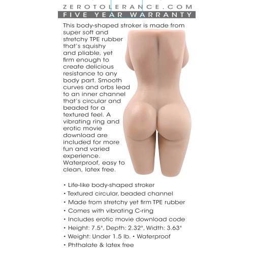 This body-shaped stroker is made from super soft and stretchy TPE rubber that's squishy and pliable, yet firm enough to create delicious resistance to any body part. Smooth curves and orbs lead to an inner channel that's circular and beaded for a textured feel. A vibrating ring and erotic movie download are included for more fun and varied experience. Waterproof, easy to clean, latex free.