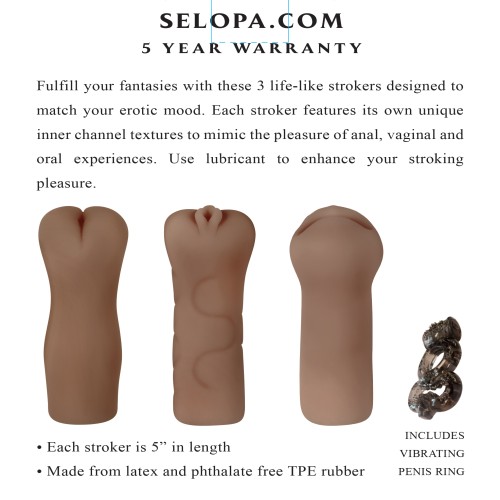Fulfill your fantasies with these 3 life-like strokers designed to match your erotic mood. Each stroker features its own unique inner channel textures to mimic the pleasure of anal, vaginal and oral experiences. Use lubricant to enhance your stroking pleasure.