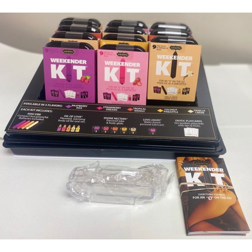 The all new Vibe Weekender Kit is here! Be ready for spontaneous fun with the perfect mix of Kama Sutra luxuries and a battery powered mini vibe with 10 vibration settings.
