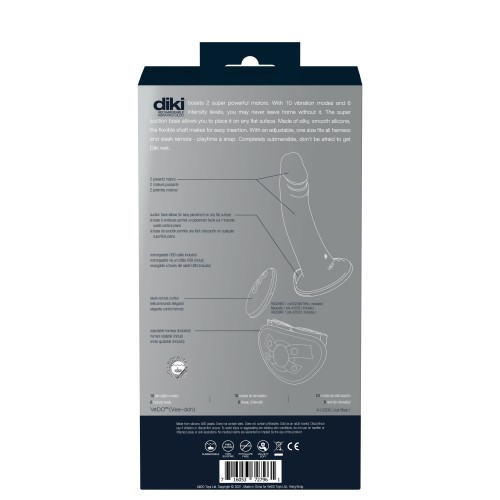 diki boasts 2 super powerful motors. With 10 vibration modes and 6 intensity levels, you may never leave home without it. The super suction base allows you to place it on any flat surface. Made of silky, smooth silicone, the flexible shaft makes for easy insertion. With an adjustable, one size fits all harness and sleek remote - playtime's a snap. Completely submersible, don't be afraid to get diki wet.