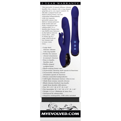 This powerful 10-speed silicone vibrator handles like a dream with a ring-shaped grip that gives you expert control. Its life-like sculpted head and hard-working bunny ears are controlled independently with two separate powerful motors that delivers intense pleasure both inside and out! Fully waterproof and submersible, it's a double-duty beauty that can fulfill your fantasies in the bath or shower worry-free.