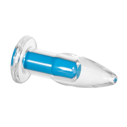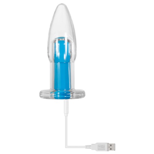 High design meets powerful vibration in this crystal-clear tapered-tip shape with a bright blue bullet inside. Use the remote control for all kinds of solo or partner hands-free options and discover the surprising erotic joy of see-through toys! Ten speeds and functions let you control your pleasure wherever you may find it, even under water as its completely submersible. Rechargeable, easy to clean, remote battery included.