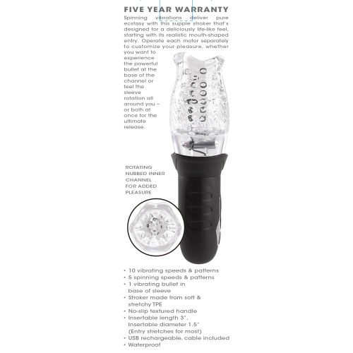 Spinning vibrations deliver pure ecstasy with this supple stroker thats designed for a deliciously life-like feel, starting with its realistic mouth shaped entry. Operate each motor separately to customize your pleasure, whether you want to experience the powerful bullet at the base of the channel or feel the sleeve rotation all around you or both at once for the ultimate release.