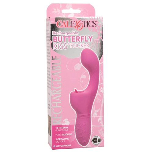 Designed for her intimate pleasure, the Rechargeable Butterfly Kiss Flicker is an erotic toy box must-have for any pleasure loving woman. This sensually contoured massager knows how to caress you intimate curves with the g-spot stimulator, flickering tongue-like teaser, and powerful dual motors. The fluttering tongue-like teaser on the arouser flutters faster with every increase of vibration to tickle external sweet spots. The blushing butterfly is a bold option for beginners and a sensual option for the erotically experienced. Indulge in 10 intense functions of vibration, pulsation and escalation with the push-button control. Dual high-intensity motors put out knee-shaking vibration throughout every inch of this passionate vibrator. Get playful with up to 50 minutes of low speed or 40 minutes of high speed vibrations with the easy touch button control. Recharge your pleasure in only 1 hour with the provided USB charging cable.