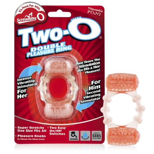 The Screaming O Two-O is a disposable vibrating cockring with two stimulating vibrating bullets, one on top and one on the bottom. The super stretchy ring slides over his shaft with the top vibrator positioned to touch her clitoris with every stroke and the bottom vibrator buzzes behind his testicles, giving c ouples something to scream about - together!