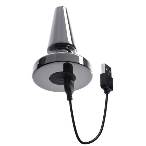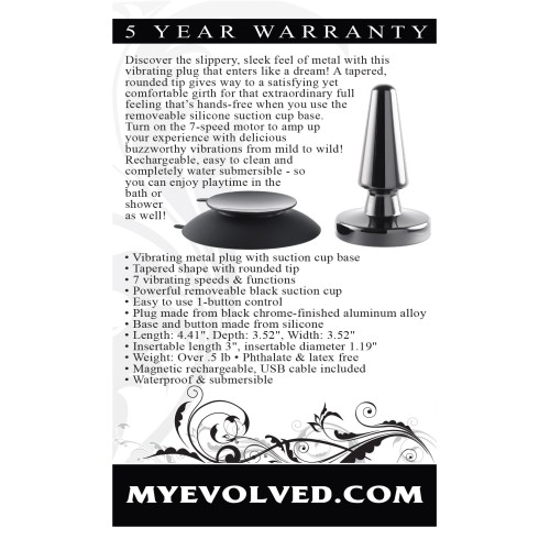 Discover the slippery, sleek feel of metal with this vibrating plug that enters like a dream! A tapered, rounded tip gives way to a satisfying yet comfortable girth for that extraordinary full feeling thats hands-free when you use the 2-sided silicone suction cup base. Turn on the 7-speed motor to amp up your experience with delicious buzzworthy vibrations from mild to wild! Rechargeable easy to clean and completely water submersible - so you can enjoy playtime in the bath or shower as well!