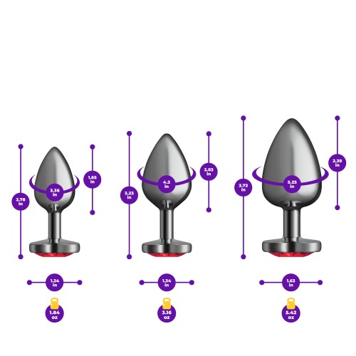 Anal Trainer Kit features one of each, a small, medium and large gunmetal, teardrop shaped anal plug adorned with a vibrant acrylic gemstone available in three colors, a sparkling deep purple, tempting teal and brand new deep red. The plugs are hypoallergenic, and made of a nonporous, body safe, nickel free, aluminum alloy. Both the plug and the acrylic anal jewelry, compatible with all lubricants. They are easy to clean and dishwasher safe butt plugs.