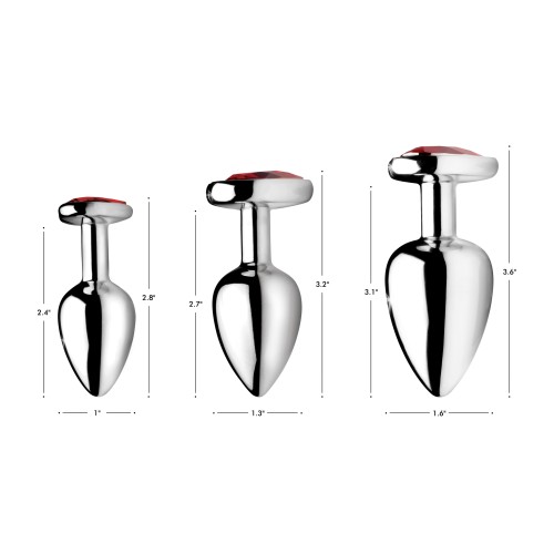 Decorate your derriere with this trio of Ruby Anal Hearts! Graduating in size from small to large to make it easy for all anal skill levels to enjoy these weighty, metal delights. Add a ruby red flash to your ass during foreplay as a warm up for the anal main event, or simply as a visual teaser for your lover to enjoy while you bend over!