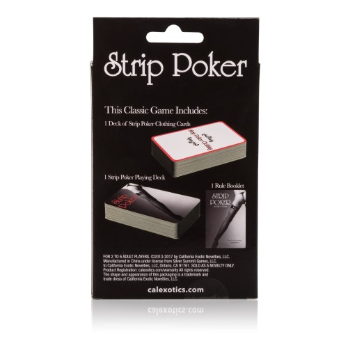 The classic game that opens the door to couples fun. Includes 1 deck of Strip Poker Cards 1 deck of Strip Poker clothing cards and rule booklet.