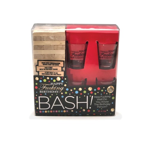 Happy Fucking Birthday Bash is an adult drinking, stacking and tumbling tower game for two or more players ages 21 and over. Celebrate the guest of honor by reading aloud the questions as you try to stack the tower without it tumbling over! This game will reveal how well you know the birthday person and if you dont know the answer TAKE A SHOT! Included in the box is 4 Happy Fucking Birthday Shot Glasses, 60 Stacking blocks with questions.