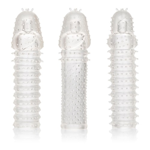 The 3 Piece Extension Kit is a set of 3 super tight, close-end extension sleeves with a ribbed texture inside and out for intense stimulation. These enlarging enhancer sleeves wrap tight to increase girth, length and explosive pleasure for everyone involved. The erotic enhancer sleeves ultra-stretchy material and spacious chamber is made to fit even the biggest man.