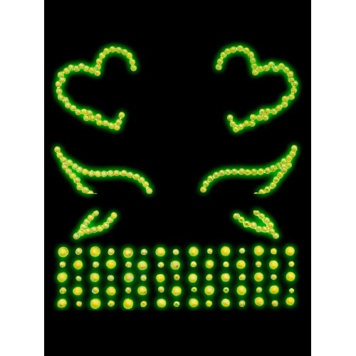 Ayla Adhesive Glow In The Dark Sticker. Dream adhesive mirror heart and rhinestone face sticker and body. Stick on adhesive face jewelry and body jewelry feature gorgeous high quality rhinestone. Use the individual pieces on your face, hair part, chest or anywhere you want extra shine! These stunning glow-in-the-dark face jewels can be worn all at once or one by one, depending on your mood. Pair with your favorite festival outfits or cute summer looks.