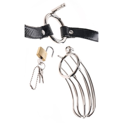 Punish your subjects misbehaved member with the Prisoners steel cock cage chastity belt. Made from high-polished steel and secured with lock and key this shiny chrome chastity cage will keep your subs cock behind bars until ypu decide to set it free. Dare your subject to get a hard on and watch as they struggle inside the prison-like confines of the cage. No matter how aroused he gets the curved steel shape prevents your sub from getting erect nut the open design still allows them the freedom to piss when they need to. You hold the key to pleasure so make sure they do as you say before you grant them in their freedom.