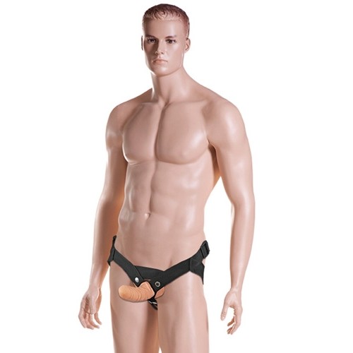 Fits over your flaccid penis. Great for men suffering from premature ejaculation or erectile disjunction. This 4-way adjustable harness keeps your mans comfort in mind and it comes with a 2 inch O-ring and has snaps that will accommodate other sized O-rings. Introductory level dildo can be switched out. This superior harness comes with two straps that wont pinch the ball sac. Caresses skin, softer, does not cut into skin. Cinch down and stay put. Fits hips up to 69 inches and comes with a hollow 6.5 inch dildo. Includes: 1- 4 way Adjustable Harness. Fits up to 69 inch (175.3cm) waist. 1 Hollow Dildo 6.5 inch (16.5cm)