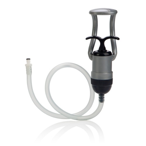 Premium travel pump system with a patent pending quick release pull tab valve maintains suction even when the hose is removed. Sturdy threaded 2 piece cylinder has a contoured grip and disassembles and nests for compact storage and travel. Universal measurements on cylinder track results. Newly designed hand pump with an easy finger grip handle. Tapered Silicone donut for secure suction. Includes the Silicone Commander erection enhancer and handy travel bag.