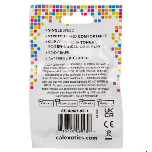 Bring back the art of foreplay with the teasing Vibrating Tongue Teaser. The marvelous mini teaser easily slides powerful vibrations onto any tongue with the soft stretchy teaser ring to enhance oral play. Slip the soft and stretchy teaser onto your tongue and delight your lover with the gently ribbed surface and shuttering bullet vibrator. These travel-ready teasers are the perfect toys to bring on any vacation or a thrilling way to spice things up in the bedroom.