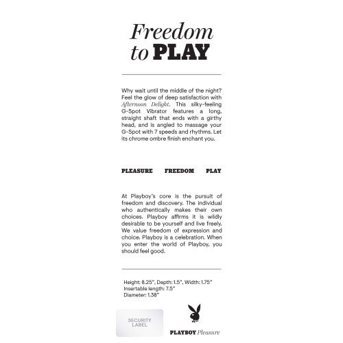 Why wait until the middle of the night? Feel the glow of deep satidfaction with Afternoon Delight. This silky-feeling G-Spot Vibrator features a long, straight shaft that ends with a girthy head, and is angled to massage your G-Spot with 7 speeds and rhythms. Let its chrome ombre finish enchant you.