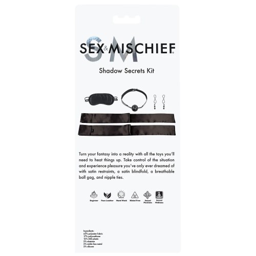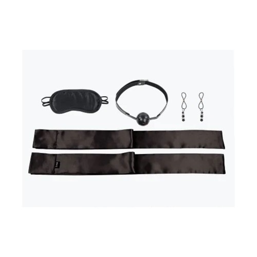 Turn your fantasy into a reality with all the toys you'll need to heat things up. Take control of the situation and experience pleasure you've only ever dreamed of with satin restraints, a satin blindfold, a breathable ball gag, and nipple ties.