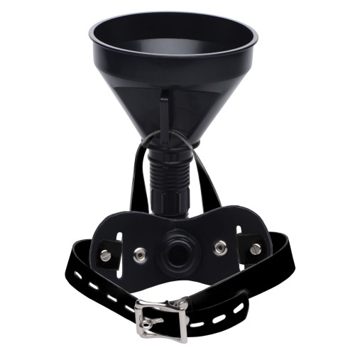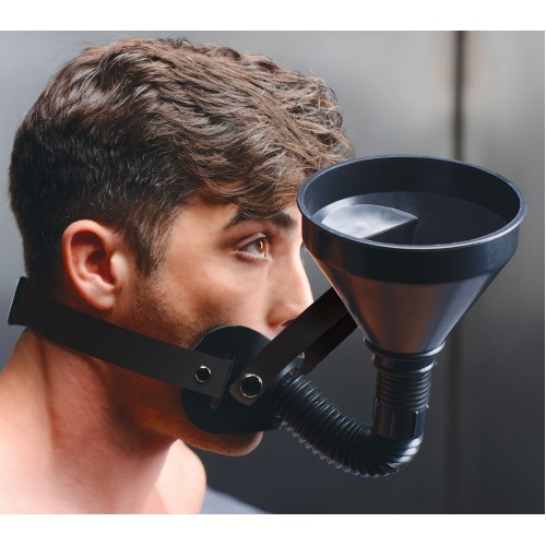 The name says it all! Pour the liquid of your choice down your slaves throat, forcing them to swallow every drop! This innovative and unusual gag adjusts around your submissive lovers head, tightening and even locking so that they cannot escape your twisted desires. The flexible funnel is held upright by a strap that snaps in place, but can be removed so you have more control. The funnel that emerges from the gag allows you to fill your plaything up with whatever you want! Take things up a notch with this sick and sadistic device! measurements:head strap adjusts from 16. 5 to 22 inches. Gag portion is 1. 85 inches insertable, 1 inch in diameter.