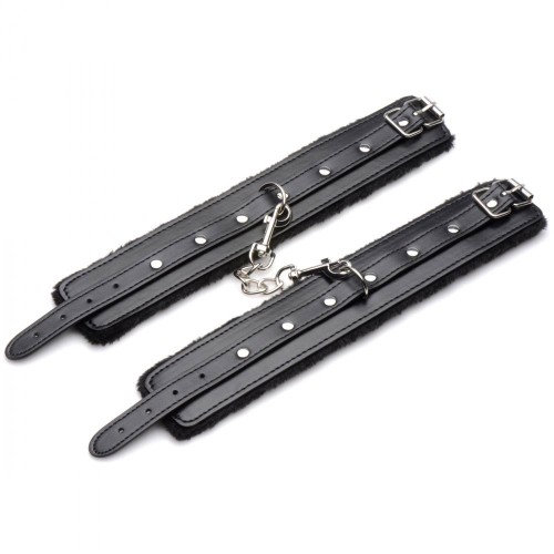 Level up your kinky play with this 10 Piece Plush Bondage set! It has everything you need for a kinky scene plus a few things youll want to add for an enhanced experience! The restraint system includes two wrist cuffs, two ankle cuffs and a collar and leash all of which are vegan friendly, PU leather. Each of the restraints fasten closed with buckle closures that adjust for comfort, plus each cuff and collar is lined with soft, faux fur! To keep their hands and wrists together, simply use the nickel-free, metal chains that attach to the D-rings on each cuff!