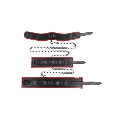 First you chain, then you tame with this versatile set. Start with the posture collar and add the single mega-cuff that fits both wrists and the single mega-cuff that fits both ankles. Connect cuffs to collar in different combinations and ultimate submission.