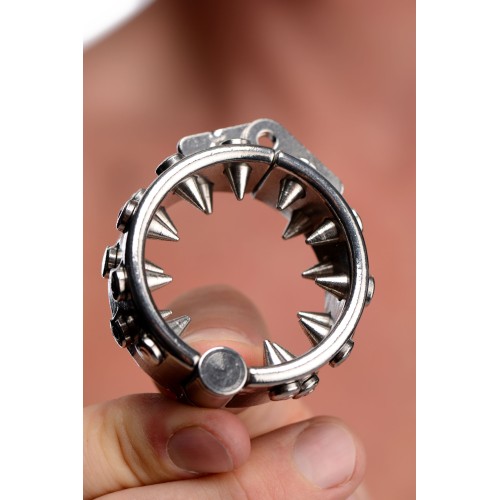 The Impaler is the CBT device you have been waiting to torment that package with! This stainless steel ring locks shut around a scrotum, penis, or all of the above to poke that tender flesh with 18 quarter-inch spikes. Sadists and masochists will both enjoy the painful effects of this uniquely evil little ring! The heavy material makes the Impaler an excellent ball stretcher, tugging down on that junk to create the one-of-a-kind feeling you crave. Put your slaves most sensitive parts under lock and key, or put yourself in a predicament with this dastardly tool!