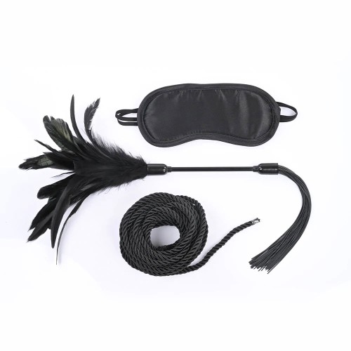 Unlock the next level of sensory play with a kit made to enhance pleasure. Tickle your partner's fancy with a feather tickler that doubles as a silicone mini whip, keep them in their place with silky cotton rope restraints, and elevate their senses with a silky-smooth blindfold.