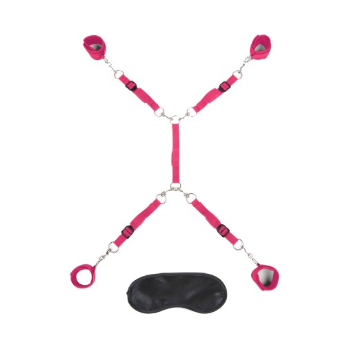 Bring the dungeon home with you with a 7-piece bondage set that easily transforms your bed into the perfect setting for unleashing all of your wildest fantasies. The Lux Fetish 7-Piece Bedspreader set includes four adjustable cuffs made of neoprene, tethers and four straps that connect to a center band that can accommodate beds of all sizes. At the end of each of the four straps is a cuff attached to an O-ring via a swivel clip that ensures your partner in comfortably secured as theyre spread across your bed restrained by their wrists and ankles. The set-up for this Spreader is easy; and when playtime is over, you can discreetly tuck the cuffs away under the mattress until next time.