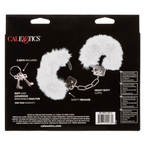 Let your lover take the lead and indulge in sensationally enhanced pleasure with the Ultra Fluffy Furry Cuffs. These versatile handcuffs are ideal for experienced restraint lovers, blushing beginners or couples looking to experience with dazzling bondage play. Give yourself over to pure ecstasy when you slip these enhanced faux fur covered metal handcuffs with lockable design. Explore endless restraint possibilities with the adjustable cuff size and durable design. Wrap around your back or around bed posts to relinquish total control to your lover and heightened pleasure while the plush faux fur keeps your wrists comfortable. The commanding cuffs are complete with 2 lock keys and a safety release latch in case of an unexpected interruptions.