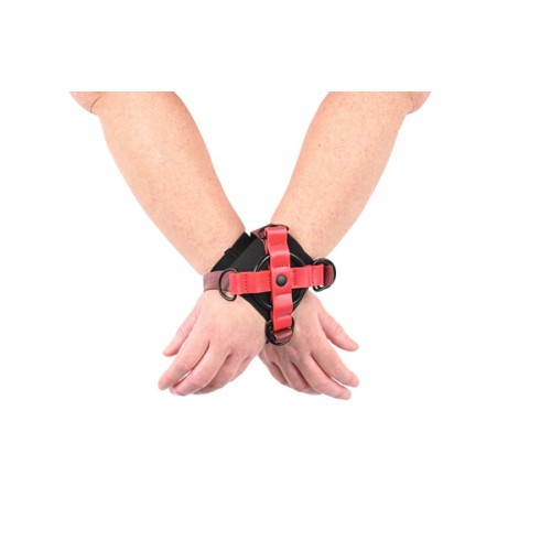 To use, simply slide your wrists into the stretch cuffs, ensuring the O Ring sits on top. Then, wrap each strap diagonally below your wrists and feed them through the opposite double D Rings. Secure by pulling the straps through both D Rings and back down through the outermost ring. Tighten to your desired fit, and you're ready to enjoy the enhanced restraint and comfort of these expertly designed cuffs. Perfect for those looking to take control or surrender in style.