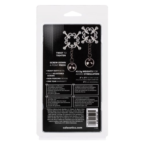 The Nipple Grips 4-Point Weighed Nipple Press is designed for sensational nipple play. Tighten the screws to exactly the pressure you desire, and let the weights pull and tug for even more intense pleasure.