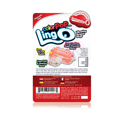 The Ling O turns your tongue into a vibrator and adds a tingly twist to oral sex. This safe and comfortable mini vibe features a super-bright and super-powered motor that stimulated with ease. Now available as a convenient ColorPoP Quickie couples can enjoy vibrant vibration at home or on the go with a disposable design they can take anywhere.