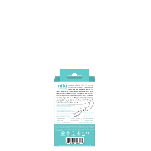 Niki rechargeable flexible magnetic panty vibe discreetly delights with 10 powerful vibration modes and 6 intensity levels. Sleek, sexy and completely flexible, this vibe is designed to fit your pleasure button the way a panty vibe should - comfortably. With a magnet to securely hold the vibe in place and sleek remote control, it's a must have for a fun night out or in. Whisper quiet and completely submersible, you can also take niki for a swim. Only you will know how much fun you're having.