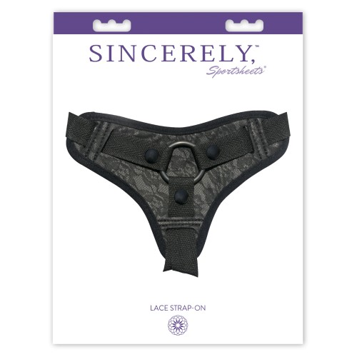 The velvety, fine lace fabric of this strap-on is part of the pleasure as it comfortably hugs your contours. Keeps your toy securely in place. 4-Way adjustable harness fits up to 60" (152cm) hips. Accomodates dildos with a flare base. Machine washable.