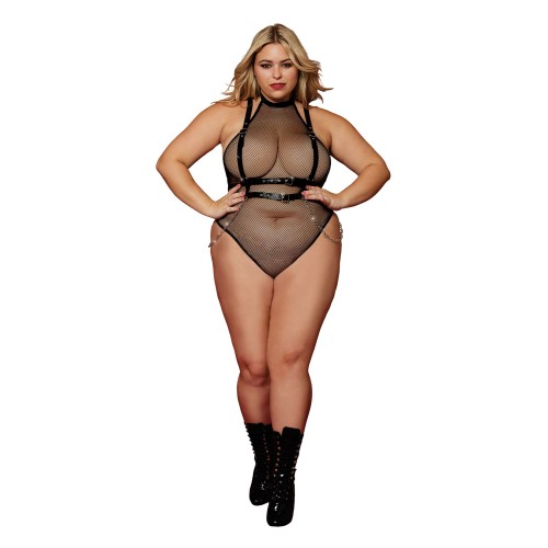 Fishnet teddy and faux-leather harness set. Halter neckline with hook and eye back closure and open back with thong. Separate faux-leather harness with adjustable shoulder straps and waist buckle details, elastic back, and attached draping chains. (thong not included).