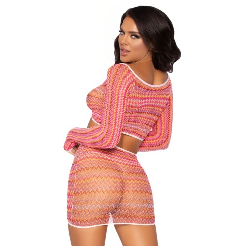 2 Pc Zig Zag Net Crop Top and Mini Dress - One Size - Pink
