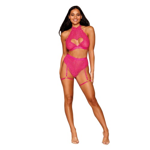 Stretch lace bralette and garter panty set. Halter bralette with heart shaped cut out and adjustable hook and slider back closure. High-waisted garter panty with heart-shaped cut out on the back. Attached/adjustable garters with gold heart accents and adjustable leg garters.