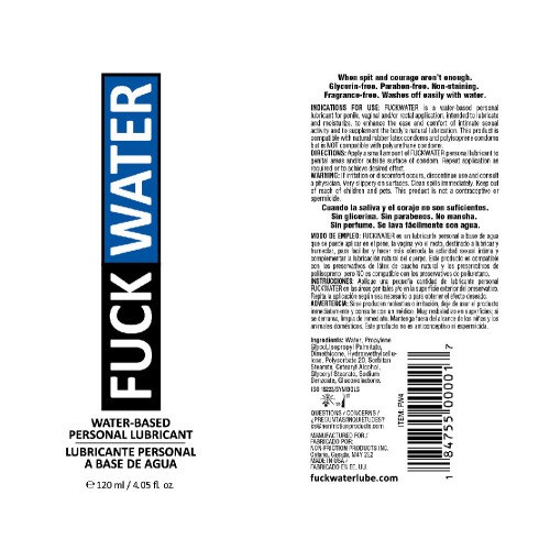 Made of only premium ingredients Fuck Water is the perfect wingman. Whether you are going out on the town or staying in alone you are never flying solo with Fuck Water at your side. Because its glycerin-free it never dries sticky. Its long lasting cleans up easily with water and delivers the perfect amount of lubrication every time. Its also paraben-free and made with the safest or someone to lend you a hand Fuck Water is the only wingman you need. Fuck Water is a water-based lube that contains the silicone ingredient dimethicone. It is latex-friendly but may react with some silicone toys. Before using Fuck Water with your favorite silicone toy please do a spot test on the bottom or base of the toy.