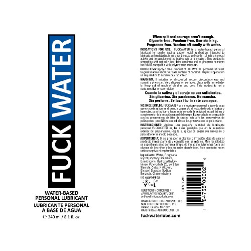 Made of only premium ingredients Fuck Water is the perfect wingman. Whether you are going out on the town or staying in alone you are never flying solo with Fuck Water at your side. Because its glycerin-free it never dries sticky. Its long lasting cleans up easily with water and delivers the perfect amount of lubrication every time. Its also paraben-free and made with the safest or someone to lend you a hand Fuck Water is the only wingman you need. Fuck Water is a water-based lube that contains the silicone ingredient dimethicone. It is latex-friendly but may react with some silicone toys. Before using Fuck Water with your favorite silicone toy please do a spot test on the bottom or base of the toy.
