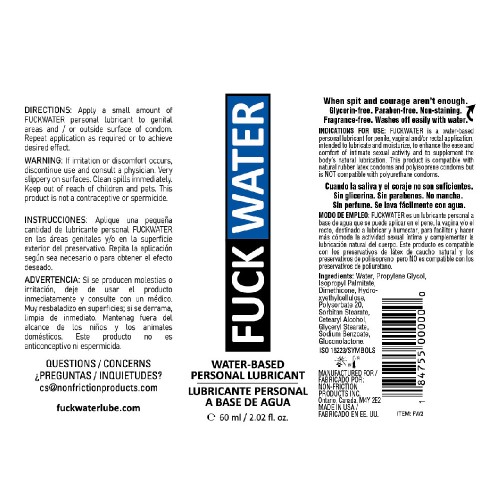 Made of only premium ingredients Fuck Water is the perfect wingman. Whether you are going out on the town or staying in alone you are never flying solo with Fuck Water at your side. Because its glycerin-free it never dries sticky. Its long lasting cleans up easily with water and delivers the perfect amount of lubrication every time. Its also paraben-free and made with the safest or someone to lend you a hand Fuck Water is the only wingman you need. Fuck Water is a water-based lube that contains the silicone ingredient dimethicone. It is latex-friendly but may react with some silicone toys. Before using Fuck Water with your favorite silicone toy please do a spot test on the bottom or base of the toy.