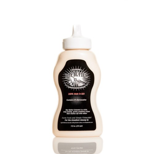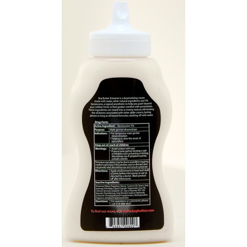 Boy Butter Extreme is a desensitizing oil-based lubricant made with 5% Benzocaine, a local anesthetic. These Ingredients are homogenized like like real butter and the end result is a personal lubricant that will numb the fun parts and last as long as any synthetic or silicone lubricant. Mixed into a creamy texture, eliminating the stickiness associated with other lubricants, as long lasting as silicone lubricants yet washes off with water alone. Better yet, it washes off with water alone, from both skin and fabric.