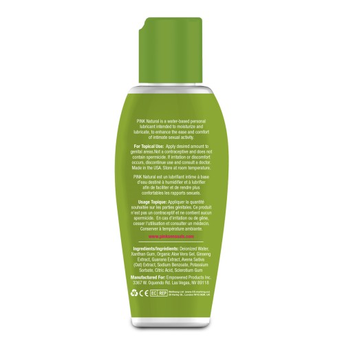 PINK Natural is our new water-based lubricant designed for women and couples looking for very high-quality body-conscious formulations. PINK Natural combines de-ionized water and organic Aloe Vera, fortified with extracts of Ginseng, Guarana and Avena Sativa (Oat). We minimized or removed most other ingredients from our very popular PINK Water formula to create PINK Natural.