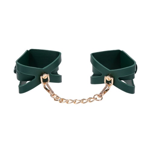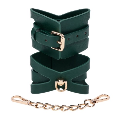 Surrender in style. The Indica Cutout Collar wraps the neck in rich emerald green with luxe gold hardware and sensual cutout accents that expose just enough skin. Lined for comfort, this collar is a soft but striking symbol of submissionan invitation to give in and give over. The coordinating gold chain leash with green handle lets your dominant guide the pace, whether youre at home or on display. Pair with the Indica Cutout Cuffs for a beautifully bound look.