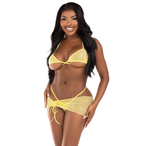 Get ready to elevate your allure with this irresistible 3 piece sarong and bikini lingerie set by Leg Avenue. The ultra flirty sheer lingerie look features a rhinestone mesh wrap around bra top, g-string panties, and a ruched tie sarong. Whether its vacation vibes or bedroom seduction, this women's lingerie set is designed to captivate hearts and set pulses racing.