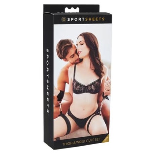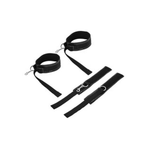 Two sets of cuffs one for the wrists the other for the thighs. Lets you restrain your partner in many positions. Adjust to fit almost any size and connect and disconnect quickly and discreet.